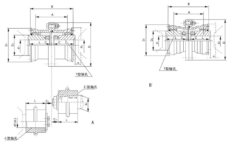 轴孔长度 D D1 D2 B A C C1 C2 e 转动惯量